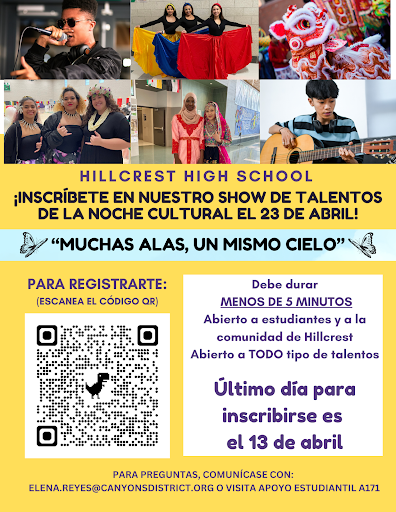 The annual Hillcrest Community Cultural Night is on April 23rd from 6:00 pm-8:00 pm. Sign up to be a part of our talent show during the night! Open to all talent. Sign up HERE. Performances must be under 5 minutes long. For questions, please contact Elena Reyes at elena.reyes@canyonsdistrict.org or visit Student Support A171.