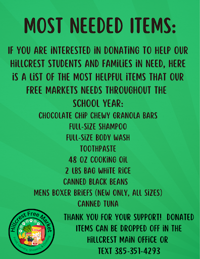 Our Hillcrest Free Market provides our students with food, clothing, laundry facilities, showers, and other essential needs. If you are experiencing greater need this season, families can reach out to Elizabeth Demke for food or other assistance at 385-351-4294.