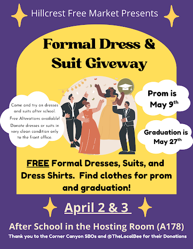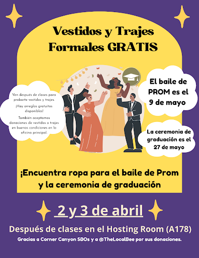 Our annual prom dress and formal wear giveaway is on April 2nd and 3rd after school in the hosting room (A178). Come find formal dresses, suits, and dress shirts. All clothing is free, including alterations. If you are interested in donating a very clean dress or suit, please bring it to the front office. Thank you to the Corner Canyon SBOs and the Local Bee for all their donations!