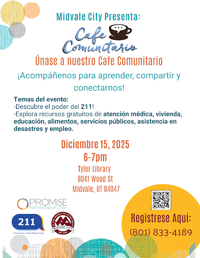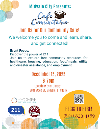 Join Midvale City for their community cafe on December 15th, 6 pm-7 pm at the Tyler Library! The event will focus on community resources for healthcare, housing, education, food, utilities, disaster assistance, and employment.