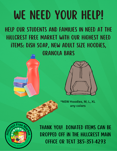 Our Hillcrest Free Market provides our students with food, clothing, laundry facilities, showers, and other essential needs. If you are experiencing a higher need this season, families can reach out to Elizabeth Demke for food or other assistance: 385-351-4294.