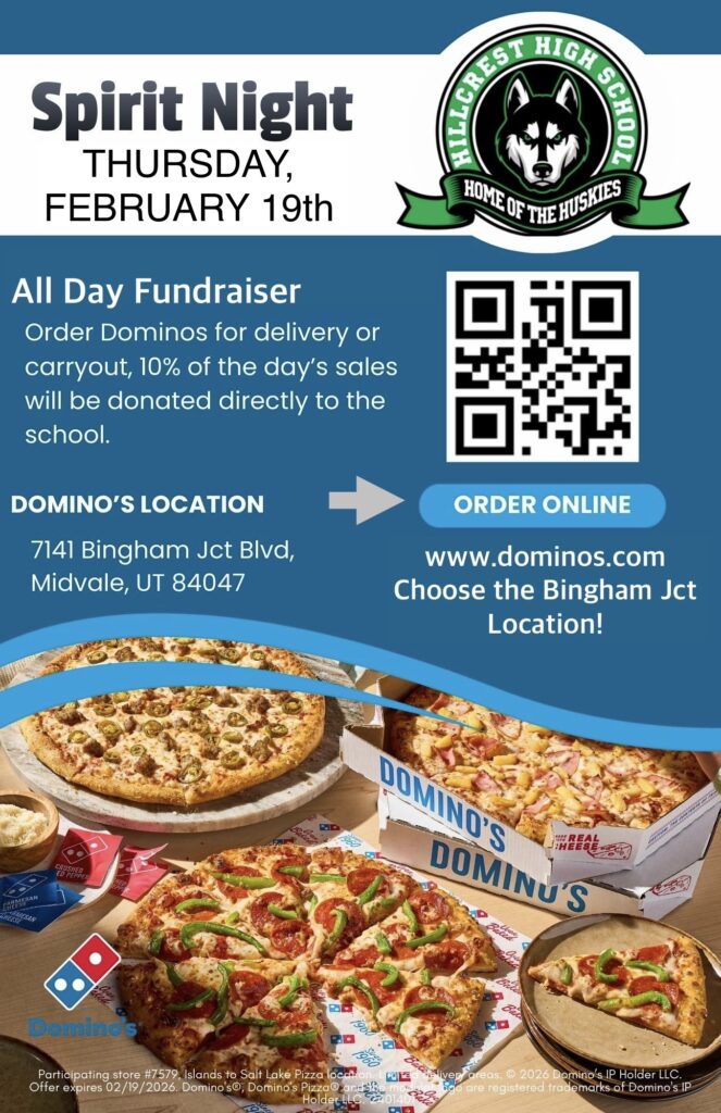 Spirit Night this Thursday, February 19th, at Domino’s Pizza at Bingham Junction! See the flier attached.