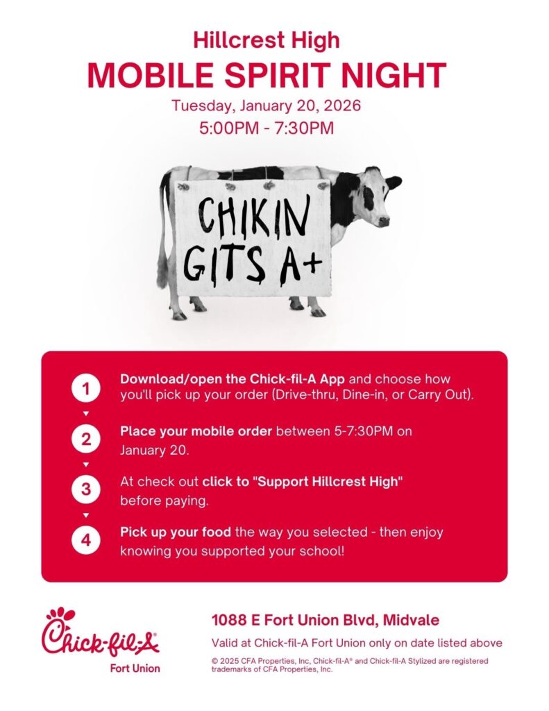 Spirit Night at Chick-fil-A next Tuesday, January 20th! This applies to mobile orders only on the app – see instructions in the flier attached. 20% of purchases will be donated to Hillcrest PTSA! Thank you for your support!