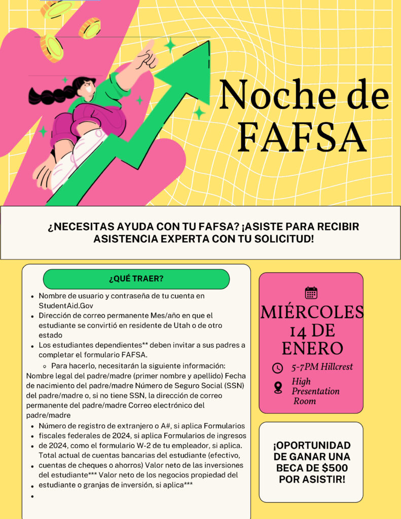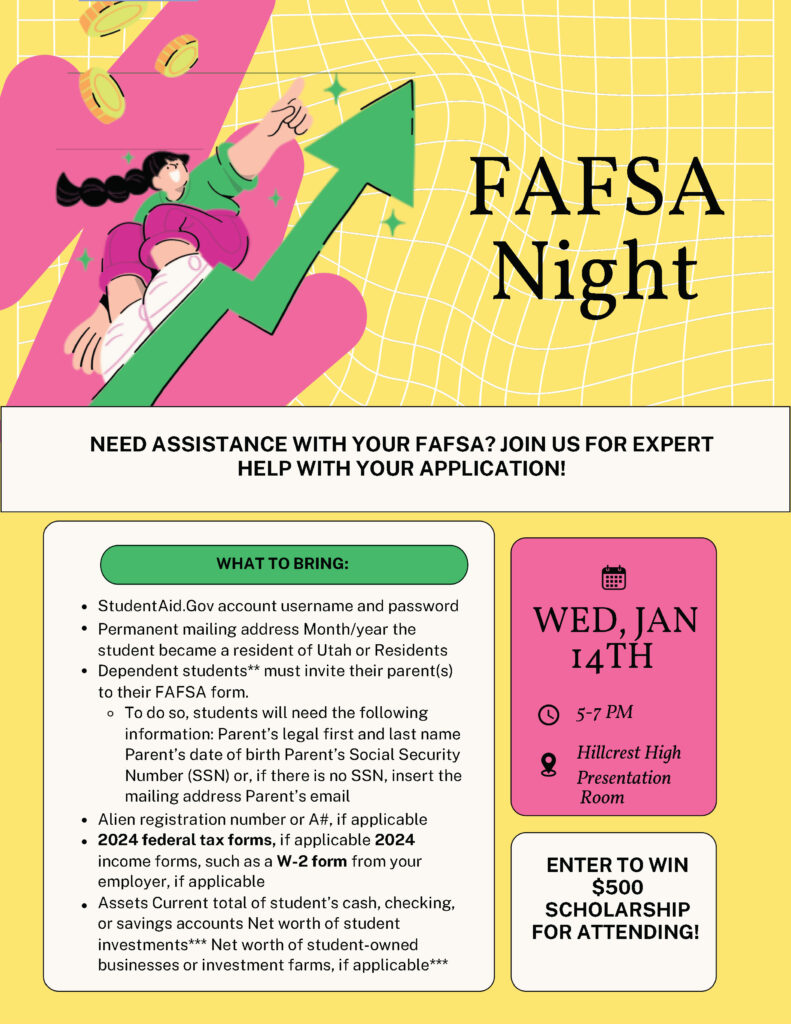 Seniors, do you need assistance with your FAFSA? Join us on Wednesday, January 14th, from 5:00 pm – 7:00 pm in the HHS Presentation Room. There will even be a chance to win a $500 scholarship for attending! Please see the flyer below for what to bring.